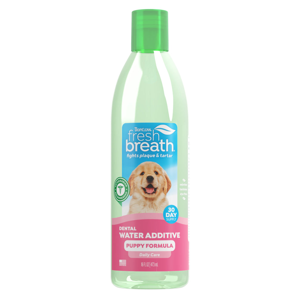 Oral care is about more than making your pets' smiles sparkle-it's an important component of their overall health. In fact, 80% of dogs begin to show signs of oral disease by age 3. With Fresh Breath Oral Care Water Additive for Puppies, dogs can benefit from daily plaque and tartar defense, simply by drinking from their water bowl. Easy to use for both you and your pet-no brushing required!