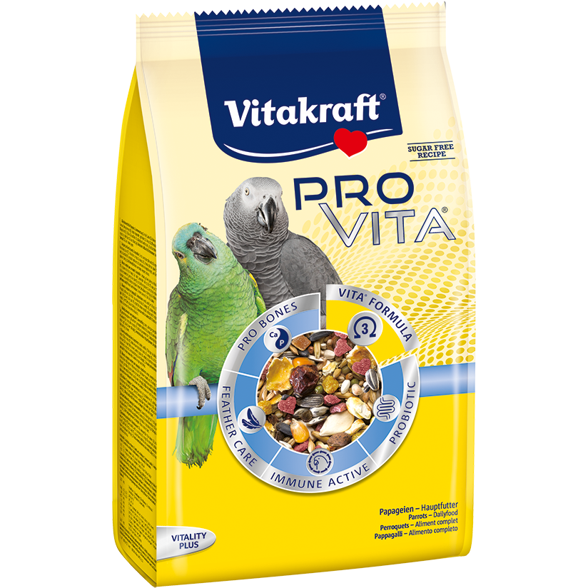 Pro Vita is a balanced, veterinarily developed staple food for parrots - with the plus for a healthy bird life! Because the functional blend contains many tasty ingredients and the unique VITA FORMULA , a combination of high-quality omega-3 fatty acids specially developed by our bird experts and an optimal balance of essential amino acids . Pro Vita guarantees perfect care for the animals - for a healthy heart, more activity and an improved well-being.
