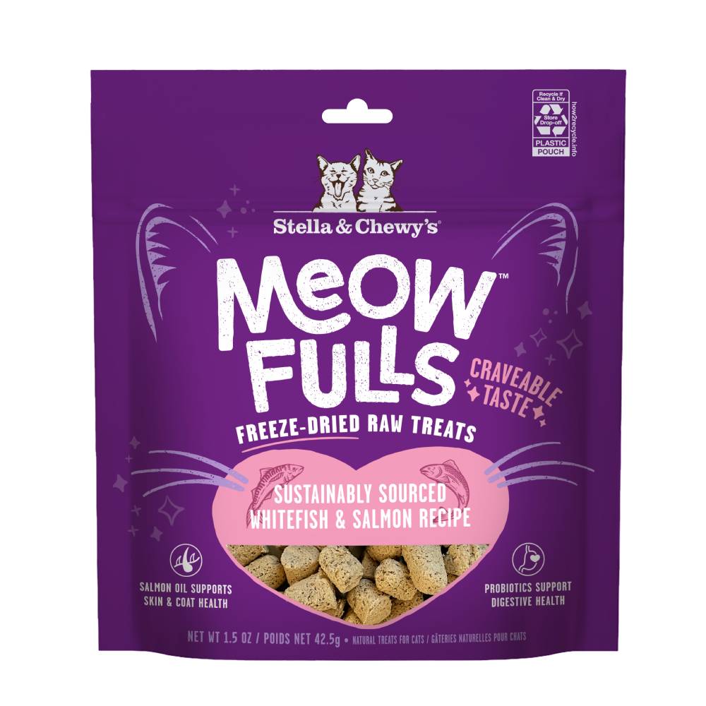 Craveable, healthy treats your cat will meow for, made from tasty proteins paired with purposeful ingredients, creating a craveable, healthy treat your cat will meow for! With added probiotics to help support digestive health, plus salmon oil to help support skin & coat health, you can feel good about treating your cat with Meowfulls.