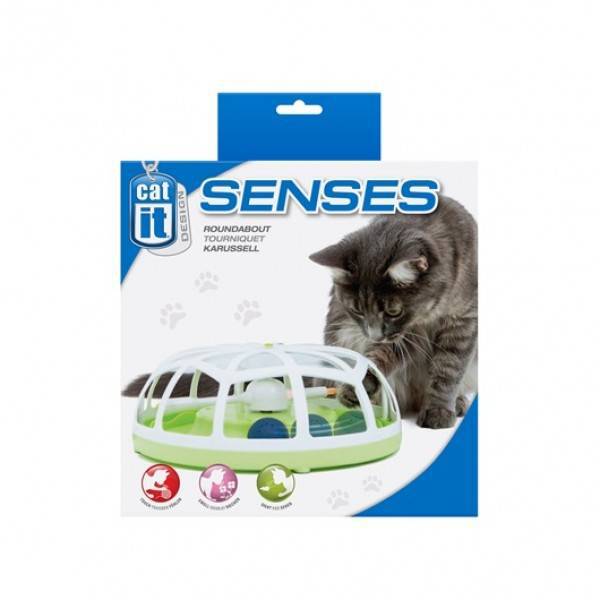 Catit Senses Roundabout is a cool interactive toy that is designed to entice your cat to play and exercise. The toy contains a revolving ball that is propelled by a spinning rod. Simply press the start button to make the ball go round and round. The revolving ball will attract your feline's attention and entice it to play as well as exercise. The tip of the rod has fibre-optic bristles that glow in the dark for added visual attraction. The ball also contains catnip for additional stimulation. The toy has windows all around for a clear inside view and multiple openings for easy access to the ball. Your cat will have a ball with this toy!