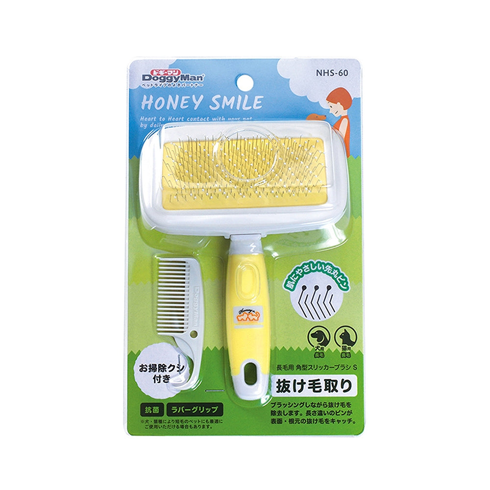 DoggyMan Honey Ball Pin Slicker Brush has ball pins that gently remove loose fur, brush out minor knots and tangles making it ideal for pets with sensitive skin. Plus, this brush includes antibacterial protection on its easy-to-hold handle grip. Suitable for use on long coat cats and dogs.