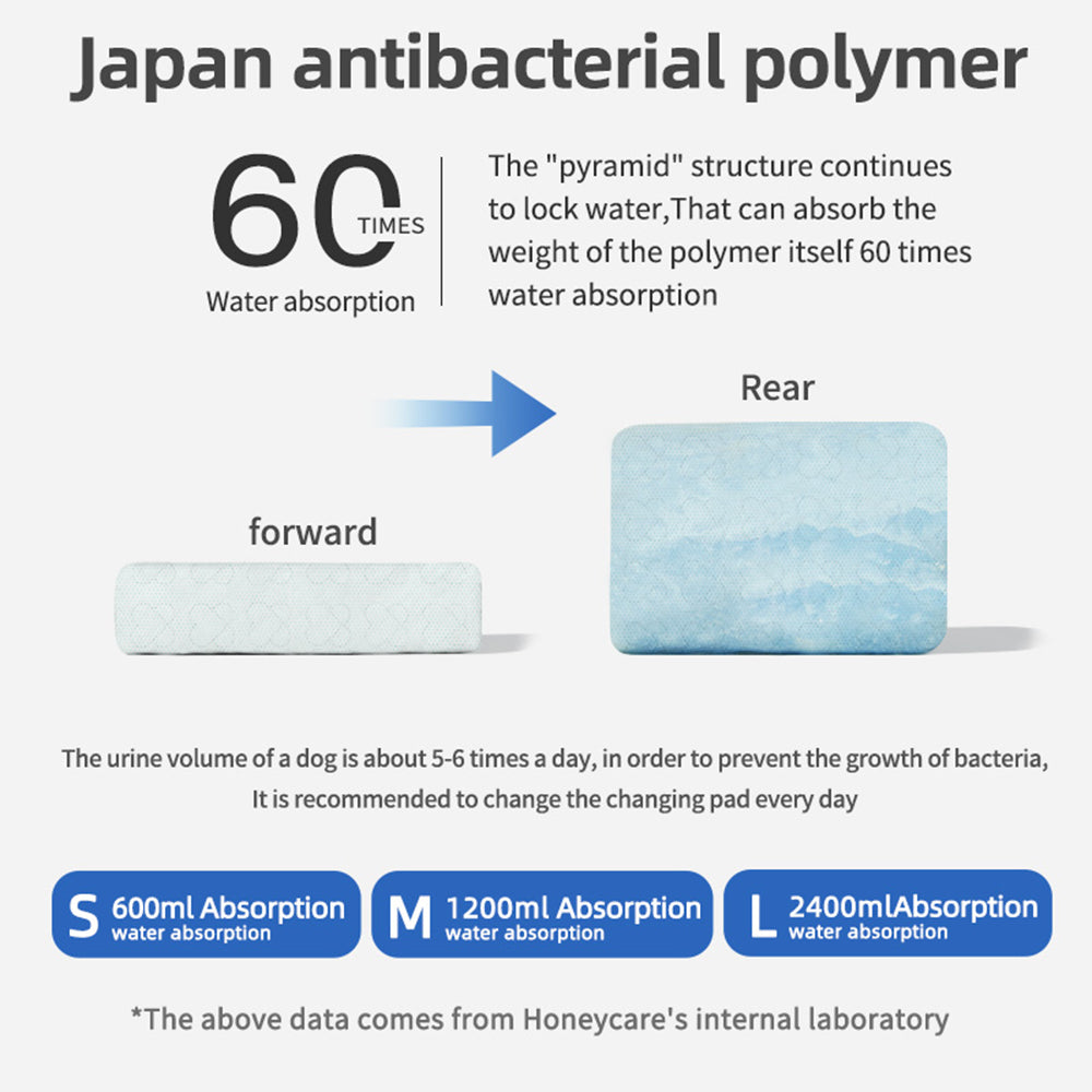 Additionally, our pads feature Japan's advanced antibacterial polymer, incorporating patented technology that releases a pleasant aroma upon contact with water. This polymer can absorb water up to 60 times its own weight. Thanks to these seven layers of protection, our L size pee pad can absorb a remarkable 2400ml of liquid, M size can handle 1200ml, and S size can absorb 600ml, all without any leakage.