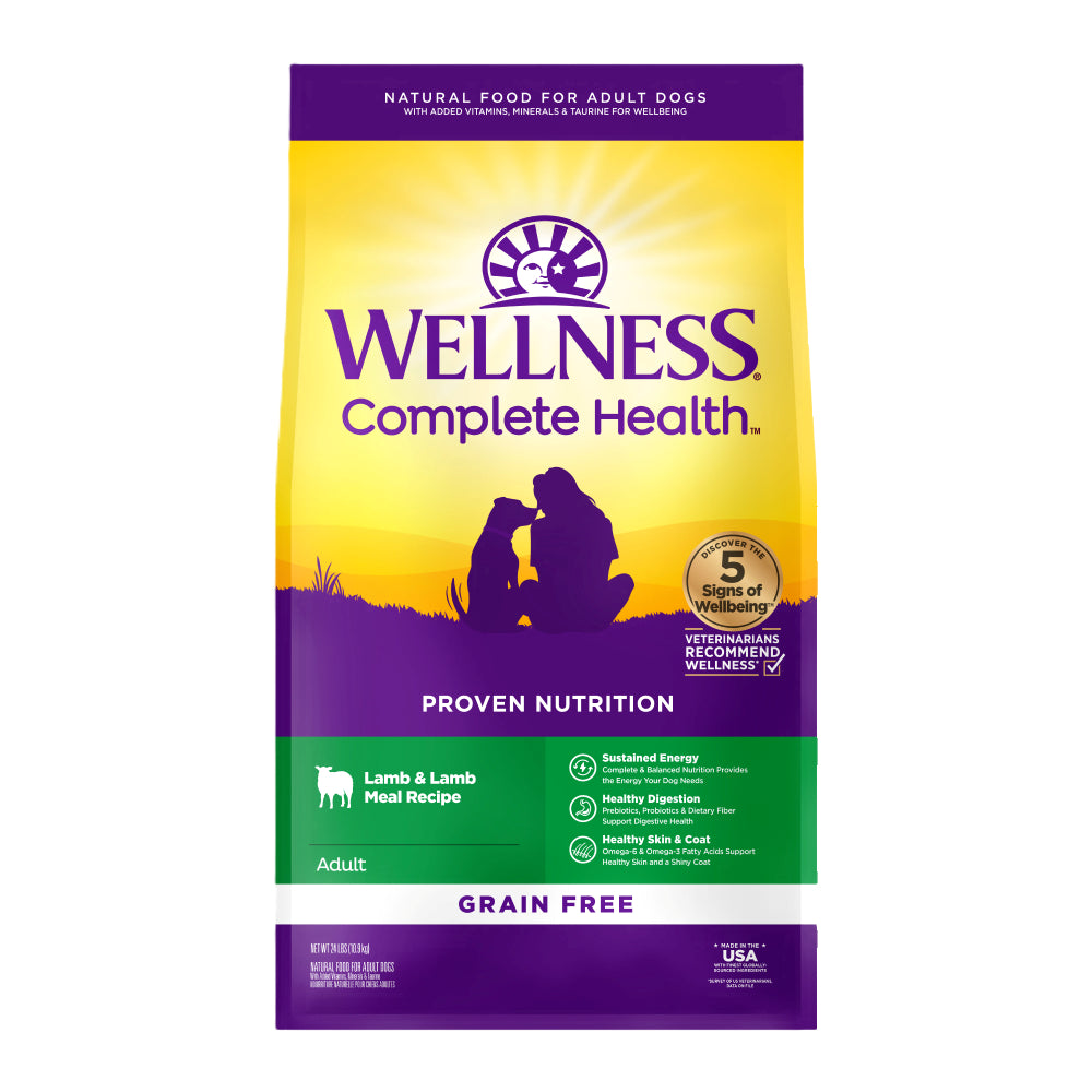Complete Health Grain Free recipes feature natural ingredients plus super nutrients for adult dogs. These delicious recipes are formulated with a balanced blend of proteins, grain free carbs and select fats, providing the energy your dog needs to thrive.Feed Wellness Complete Health Grain Free and see the 5 Signs of Wellness in your pet, including the following-guaranteed.
