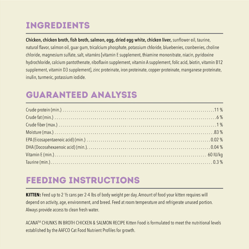 Specially crafted for your kitten, our ACANA First Feast Recipe helps support your kittens growth and development. Rich with 70% quality animal ingredients including fresh or raw free-run chicken and whole herring, First Feast has the animal protein your kitten needs to grow up strong. This nutrient-dense recipe also helps support key health benefits for your kitten, including healthy skin and coat, healthy muscles and bones, and eye and brain development. Nurture your kitten with a recipe tailored to help them grow up healthy and happy with ACANA First Feast!
