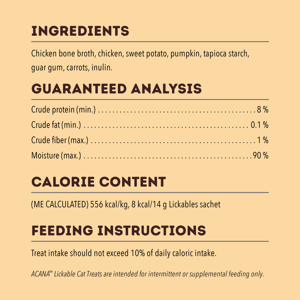 Share a special moment with your cat by treating them to delicious ACANA Lickables! Crafted with protein-rich animal ingredients and hydrating bone broth, Lickables treats will tempt your cat to come closer and purr with enjoyment as they bond with you and experience a burst of flavor. These treats are the perfect texture for hand feeding simply knead, tear and squeeze the pouch to feed your cat a delicious pure, without any mess. Our Chicken Recipe also helps support healthy digestion, giving your cat benefits in every pouch. Your cat will love this creamy, smooth pure, and you'll love getting closer to your favorite furry friend!