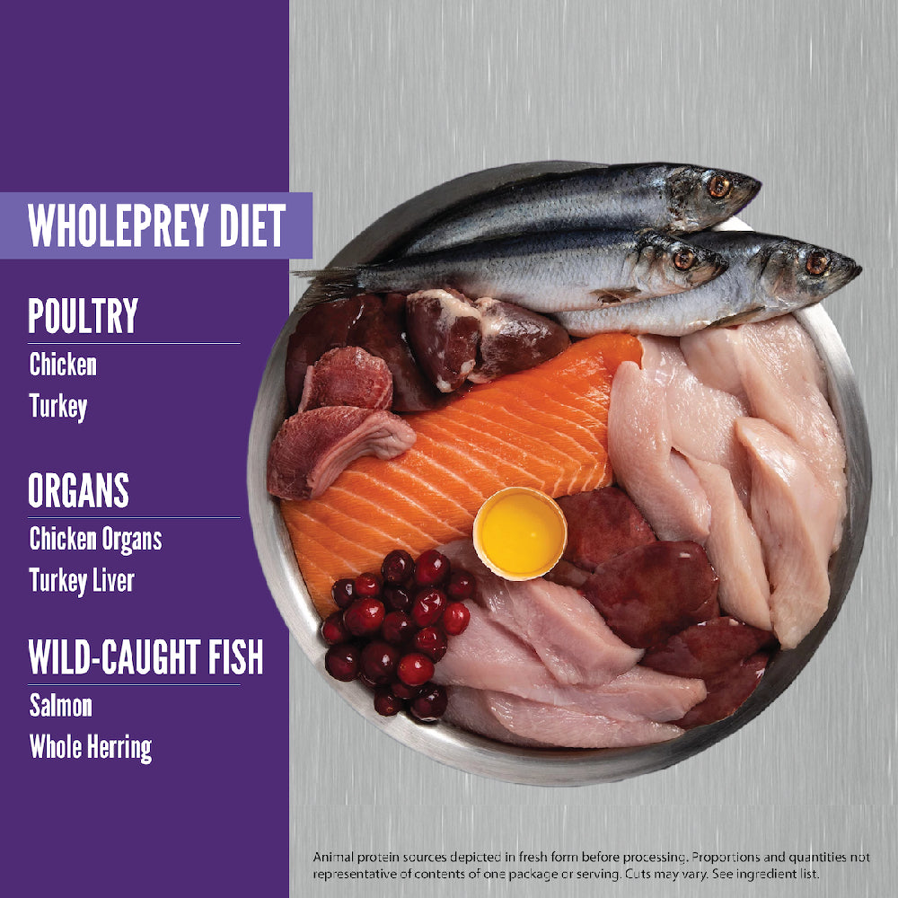 - Our authentic WholePrey diet features the most nourishing parts of the prey like poultry or fish, and organs to mimic what your dog's ancestors consumed in the wild.