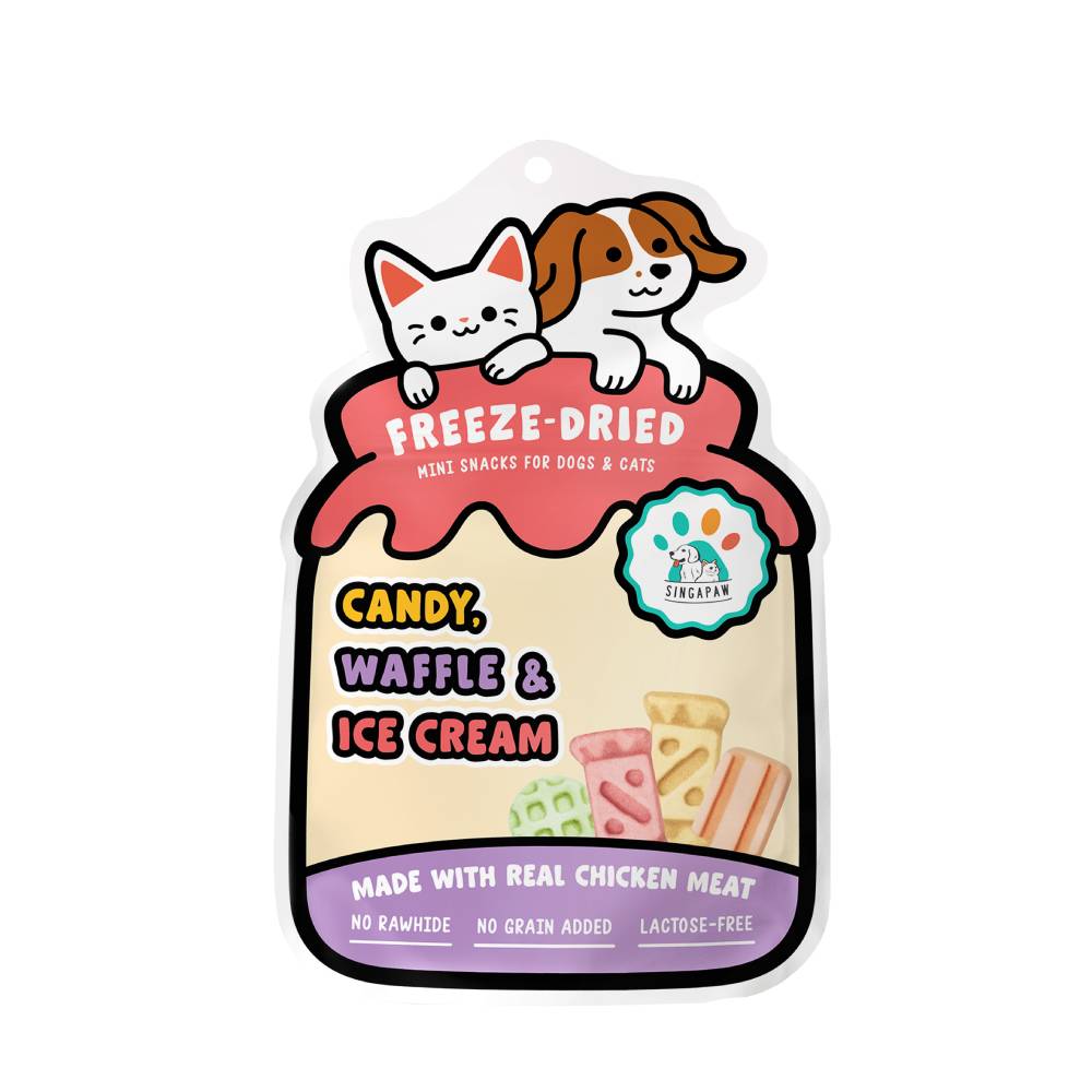 SINGAPAW MINIS freeze-dried treats for dogs and cats are made with real chicken meat and limited ingredients. Packed with protein, these fun-shaped treats are great for bonding with your pet. Delicious straight from the pack or rehydrated with water or goat’s milk for an extra delight!