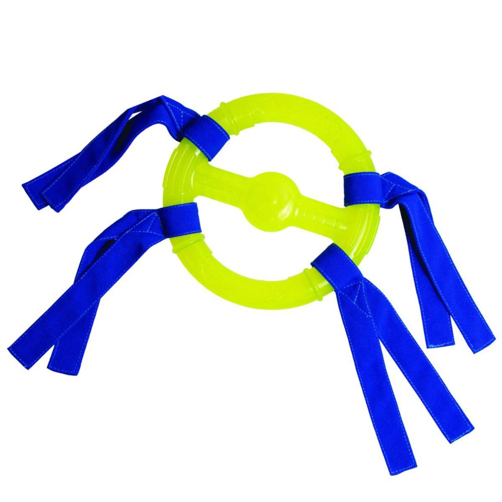 Power up playtime with Power Play Dog Toys from Nylabone! The versatile Ring Thing combines a variety of materials and play patterns to create your furry friend?s new favorite in interactive dog toys. The grippy textured ring is made of a flexible plastic material and the tassels are constructed of durable double-layered canvas, making it a tough dog toy perfect for teasing, tugging, and tickling. Get ready to take your dog to the beach, lake, or favorite body of water because this dog ring toy also floats! Fun to throw by the ring or the tassel, the soft material of this dog fetch toy is easier and safer for your furry friend to catch. Plus, the ring design has a raised oval center that makes it even simpler for your dog to catch and pick up. Designed in colors that are highly visible to our four-legged friends, this blue and yellow dog toy offers hours of playing potential! Tug harder, soar farther, and play harder with the Original Ring Thing!