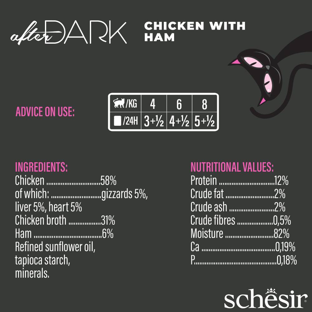 Chicken 60% (gizzards 5%, livers 5%, hearts 5%), chicken broth 29%, ham 6%, refined sunflower oil, tapioca starch, minerals