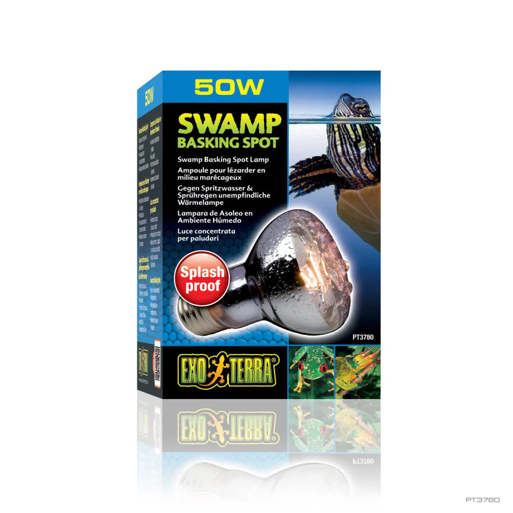 The Exo Terra Swamp Basking Spot is a splash and mist resistant basking spot lamp designed for use in aquatic or extremely humid terrarium set-ups, where high humidity or accidental water spillage could cause a regular basking lamp to burn out or shatter. The outer sleeve is made from extra-strong neodymium glass.