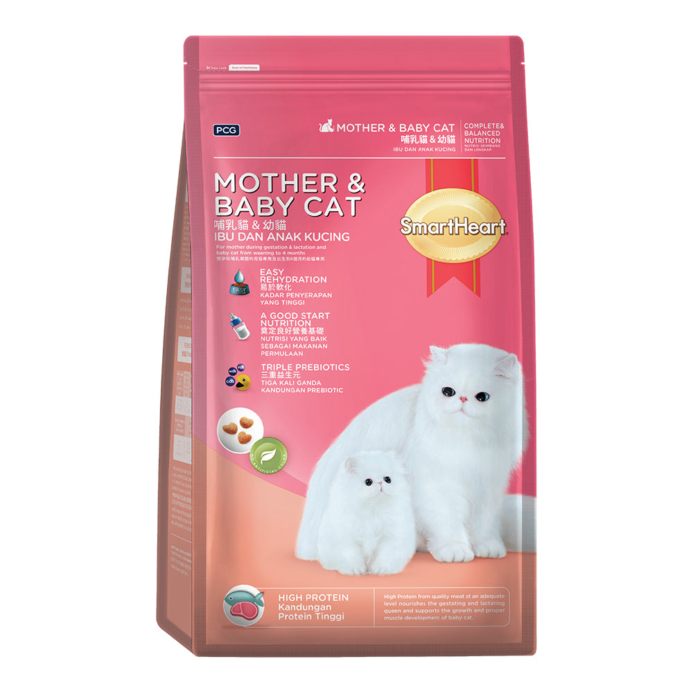SmartHeart Dry Cat Food Mother & baby care formula is designed to ensure that mother cat obtains an optimal level of nutrients during a gestation and lactation period. Lactation is a golden period for a baby cat to receive well nutrients and develop strong immune system from the breast-feeding since an early stage of life. SmartHeart Dry Cat Food Mother & baby care formula is also tailored-made as an ideal first food for a baby cat to be ready to switch to SmartHeartafter weaning.
