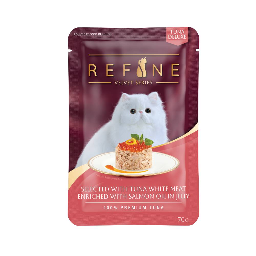 The REFINE Velvet Pouch – Tuna Whitemeat enriched with Salmon Oil in Jelly is made with 100% premium white meat tuna and chicken, with added salmon for revitalized skin and luxurious coat.