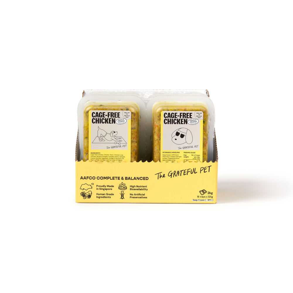 Packed with plenty of nutrients, our complete & balanced gently cooked meal for dogs is made with only the good stuff: quality cage-free chicken muscle meat, offal, fresh vegetables, botanicals and superfoods. It is 100% fresh and all-natural. No prep, no nasties and no mystery meat – just super great food for super great dogs.