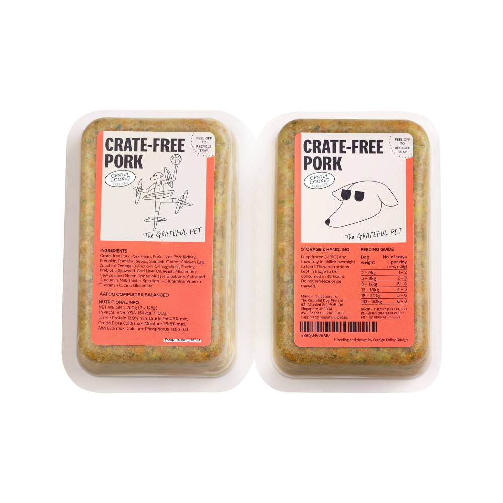 Packed with plenty of nutrients, our complete & balanced gently cooked meal for dogs is made with only the good stuff: quality crate-free pork muscle meat, offal, fresh vegetables, botanicals and superfoods. It is 100% fresh and all-natural. No prep, no nasties and no mystery meat – just super great food for super great dogs.