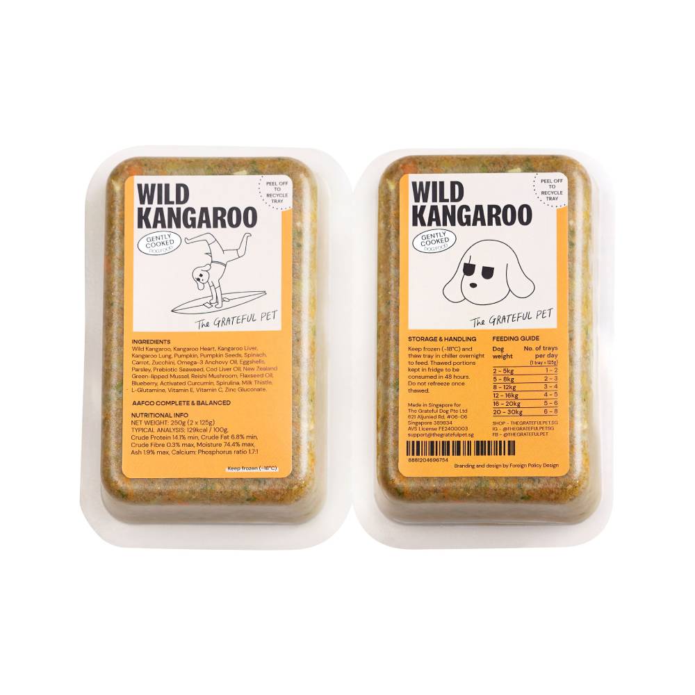 Packed with plenty of nutrients, our complete & balanced gently cooked meal for dogs is made with only the good stuff: quality wild kangaroo muscle meat, offal, fresh vegetables, botanicals and superfoods. It is 100% fresh and all-natural. No prep, no nasties and no mystery meat – just super great food for super great dogs.