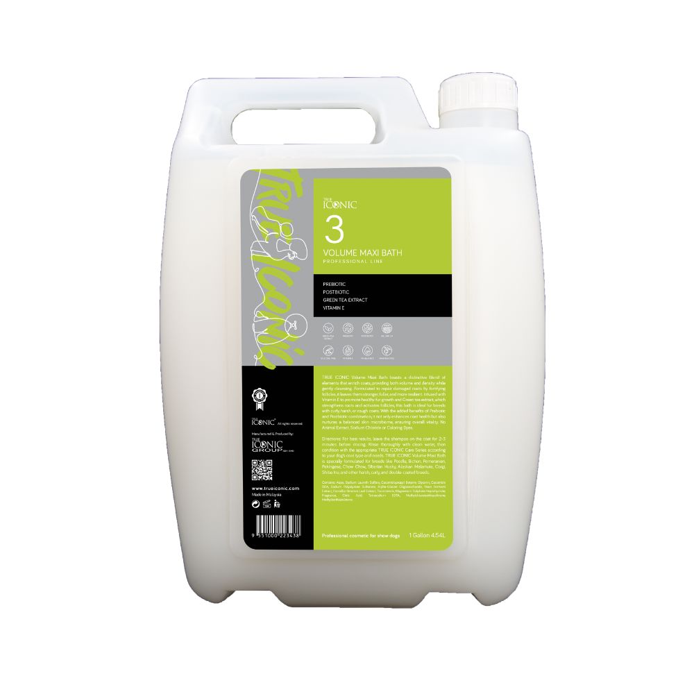 TRUE ICONIC Volume Maxi Bath boasts a distinctive blend of elements that enrich coats, providing both volume and density while gently cleansing. Formulated to repair damaged coats by fortifying follicles, it leaves them stronger, fuller, and more resilient. Infused with Vitamin E to promote healthy fur growth and Green tea extract, which strengthens roots and activates follicles, this bath is ideal for breeds with curly, harsh, or rough coats. With the added benefits of Prebiotic and Postbiotic combination, it not only enhances coat health but also nurtures a balanced skin microbiome, ensuring overall vitality. No Animal Extract, Sodium Chloride or Coloring Dyes.