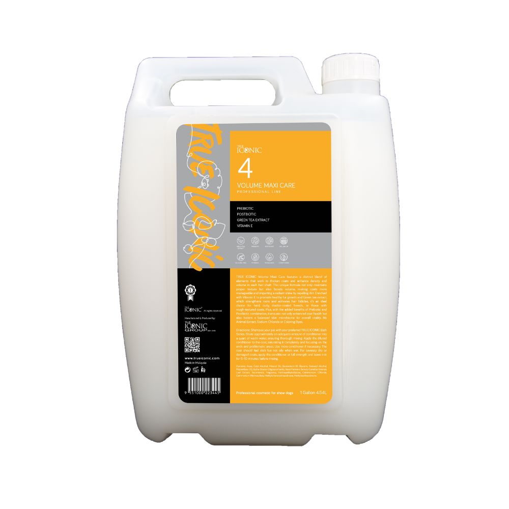 TRUE ICONIC Volume Maxi Care features a distinct blend of elements that work to thicken coats and enhance density and volume in each hair shaft. This unique formula not only maintains proper texture but also boosts volume, making coats more manageable and imparting a radiant shine by repelling dirt. Enriched with Vitamin E to promote healthy fur growth and Green tea extract, which strengthens roots and activates hair follicles, it's an ideal choice for hard, curly, double-coated breeds, or those with rough-textured coats. Plus, with the added benefits of Prebiotic and Postbiotic combination, it ensures not only enhanced coat health but also fosters a balanced skin microbiome for overall vitality. No Animal Extract, Sodium Chloride or Coloring Dyes.