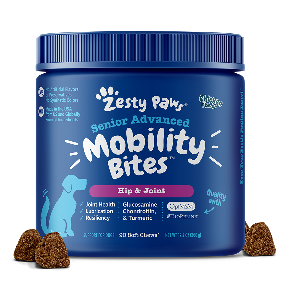 Zesty Paws Advanced Hip & Joint Mobility treats are formulated with a blend of powerful ingredients that promote flexibility, mobility, range of motion, and comfort for dogs at advanced ages.