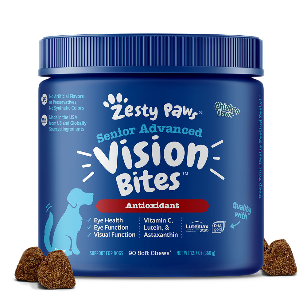 Zesty Paws Senior Vision Bites are grain free chewable supplements with vitamins, antioxidants, and Omega-3 to promote eye health for senior dogs of any breed or size.